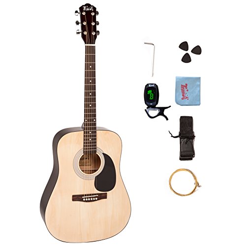 Trendy 41 Inch Full Size Dreadnought 6 Steel String Beginner Acoustic Guitar Package with Clip-On E-Tuner, Extra Strings, Strap, Picks and Polishing Cloth - Natural