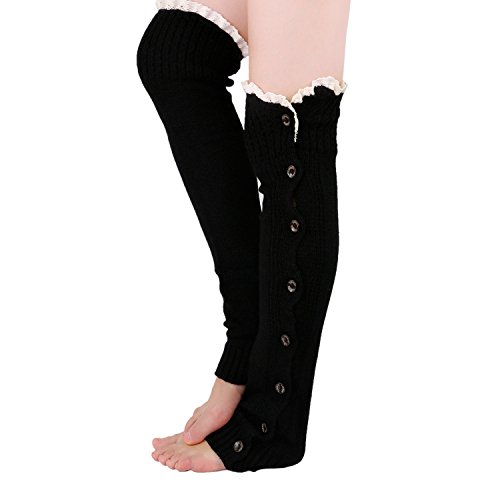 Tirain Women Knitted Flat Button Down Crochet Leg Warmers with Lace Trim FBA(Black)