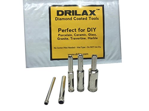 Drilax 5 Pieces Diamond Coated Hollow Core Drill Bit Set 3/16, 1/4, 5/16, 3/8, 1/2 Inch Drilling Tile Glass Fish Tank Granite Ceramic Porcelain Bottles Quartz Lot Kitchen Bathroom Shower Lamps