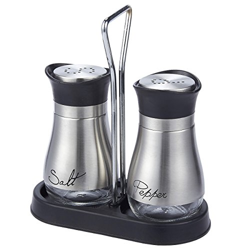 Salt and Pepper Shakers Set - High Grade Stainless Steel with Glass Bottom and 4' Stand - 4" x 6" x 2", 4 oz.