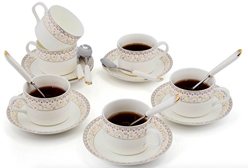 Porcelain Tea Cup and Saucer Set Coffee Cup with Saucer and Spoon 18 pc, Set of 6 (Floral)