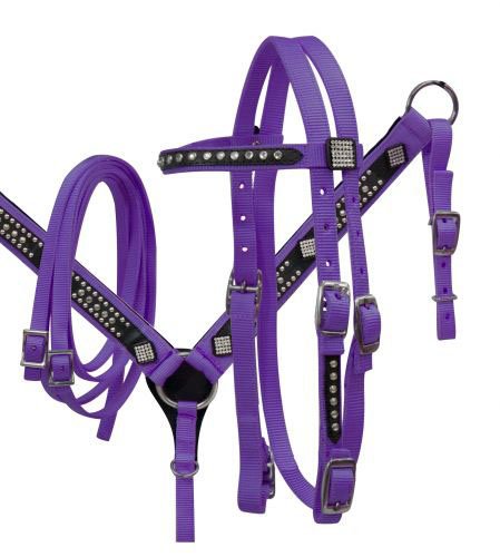 Showman Pony Bling Headstall, Split Reins and Breast Collar Set. Black Overlay with Silver Studs and Crystal Rhinestones.