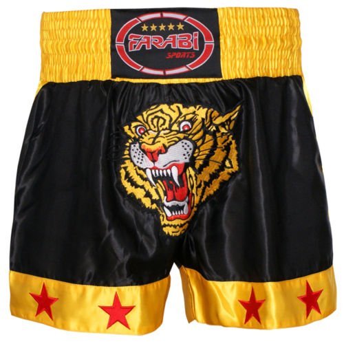 Muay Thai Shorts Kick Boxing Training Satin Black Gold Short Tiger Embroidery