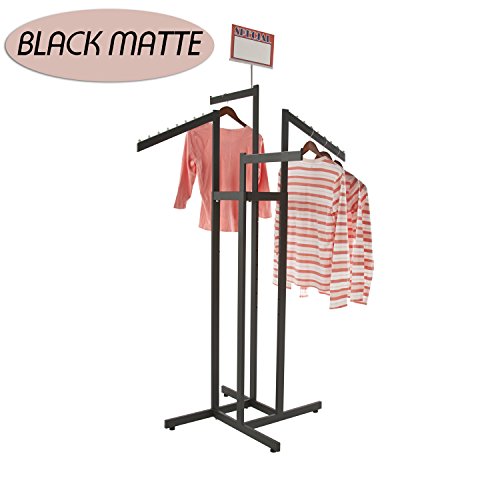 Clothing Rack – Heavy Duty Black 4 Way Rack, Adjustable Arms, Square Tubing, Perfect for Clothing Store Display With 2 Straight Arms and 2 Slanted Arms