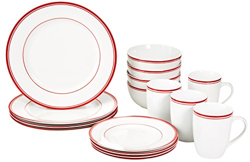 AmazonBasics 16-Piece Cafe Stripe Kitchen Dinnerware Set, Plates, Bowls, Mugs, Service for 4, Red