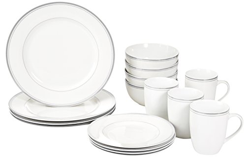 AmazonBasics 16-Piece Cafe Stripe Kitchen Dinnerware Set, Plates, Bowls, Mugs, Service for 4, Grey