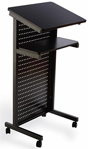 Displays2go Mobile Podium, 46.5 x 23 Inches, Locking Wheels, Shelf Included, Black Steel, MDF Wood (LCTMOBMETB)