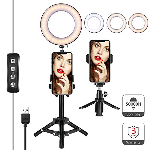 Selfie LED Ring Light 6" with Tripod Stand & Phone Holder, for Live Stream/Makeup Video or YouTube, Desktop Mini Ring Light for iPhone Android Phone with Three Different Shades and Eleven Brightening