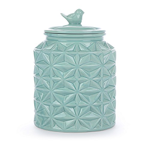 Turquoise Vintage Ceramic Kitchen Flour Canister/Cookie Jar w/Abstract Star Design & Bird Topped Lid