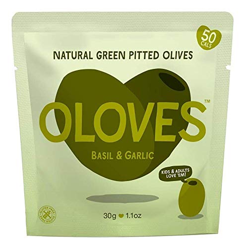 Oloves Basil & Garlic | Fresh Green Pitted Olives | All Natural | Healthy Snack | Vegan | Gluten Free | Kosher | Low Cal | 30 Pack (1.1oz Bags)