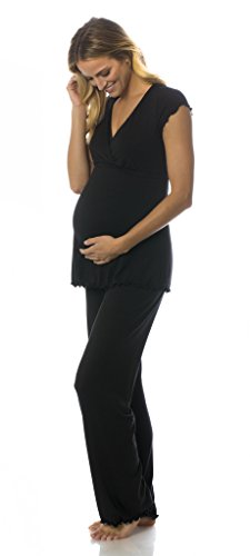 Majamas Genna PJ - Women's Short Sleeve v-Neck Maternity Pajama Set with Nursing Access for Breastfeeding - Made in The USA Black