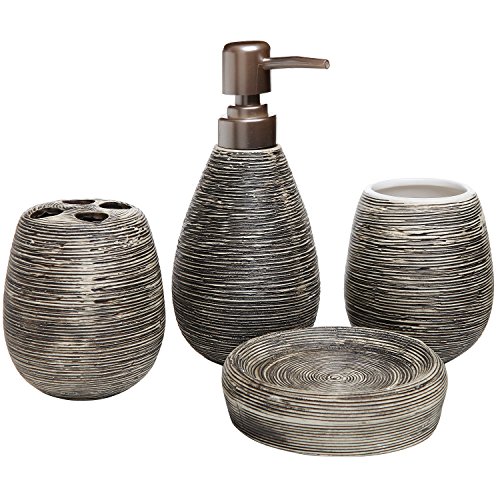 MyGift 4 Pc Line Textured Dark Brown Ceramic Soap Dish, Soap Dispenser, Toothbrush Holder & Tumbler Bathroom Set