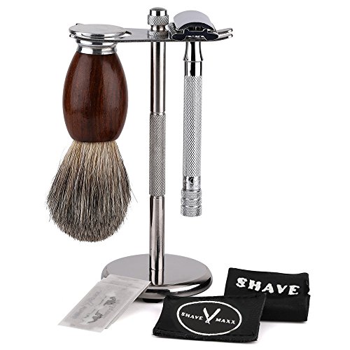 ShaveMaxx, Shaving Gift Set, Stand, Safety Razor (Long Handled), 100% Badger Brush, Blades, Blade Guard, Polishing Towel, Well Presented Gift Box,