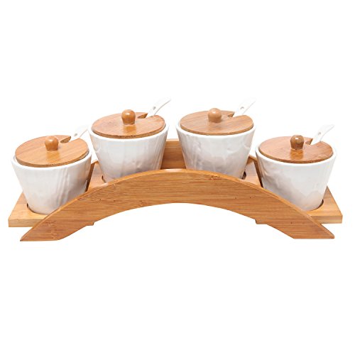 4 White Ceramic Condiment Spice Jars w/ Serving Spoons, Bamboo Lids & 4 Tier Bamboo Bridge Holder Rack