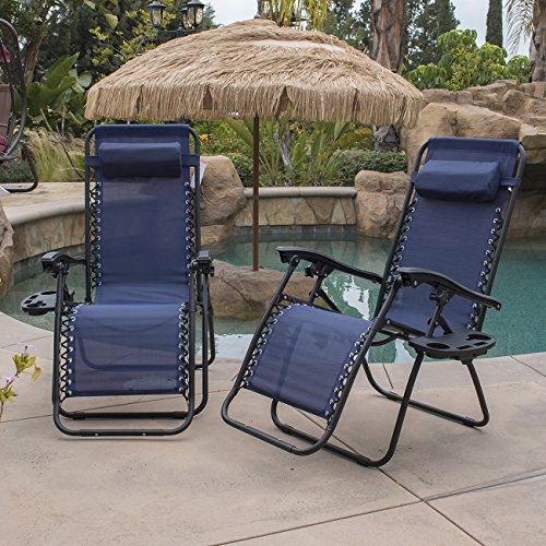 Belleze 2pc Lounge Patio Zero Gravity Chairs Beach Backyard Yard Adjustable Recliner Yard w/Utility Tray Holder, Navy Blue