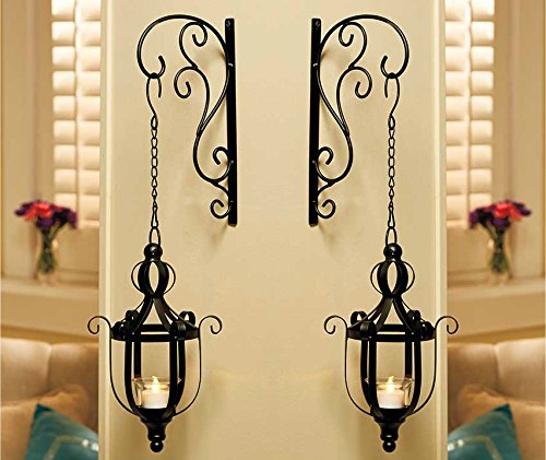 Set of 2 Black Metal Decorative Wrought Iron Hanging LED Candle Lantern Sconce Home Accent Decoration