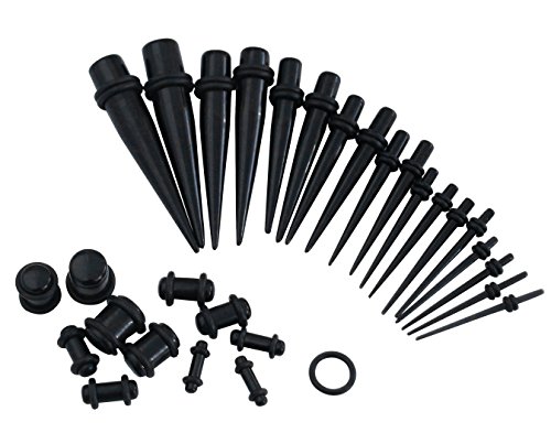 CrazyPiercing Black Taper Stretching Guages Kit with Black Acrylic Plug Kit 30 Pieces (30 pcs) (black)