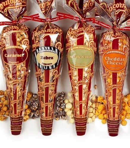 Popcornopolis Gourmet Popcorn - 4 Cones - Cheddar Cheese, Zebra, Caramel & Kettle - Small Storage Space Friendly!