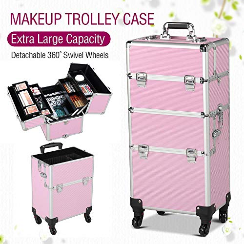 Yaheetech 4 wheels 3 in 1 Professional Rolling Train Cases, Pink Makeup Artist Cosmetic Trolley Cosmetic Makeup case Multifunction Aluminum