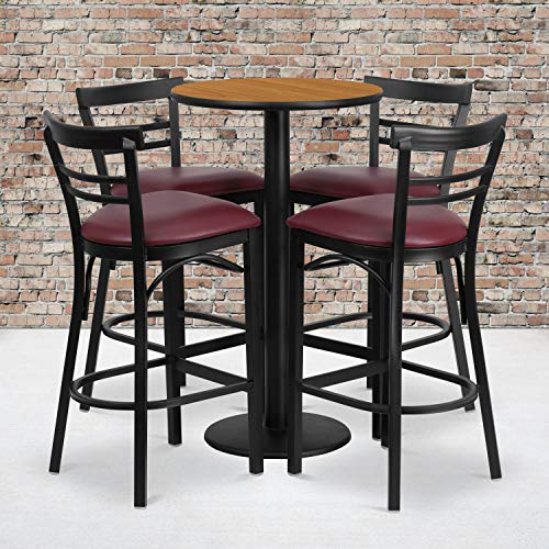 Flash Furniture 24'' Round Natural Laminate Table Set with Round Base and 4 Two-Slat Ladder Back Metal Barstools - Burgundy Vinyl Seat