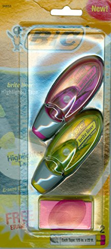 BIC - Brite Liner Highlighter Tape, Yellow/Pink, 2/Pk With Eraser