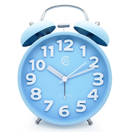JCC Easy-to-read White Arabic numerals Twin bell Silent Quartz Analog non ticking sweep second hand bedside alarm clock (Blue)