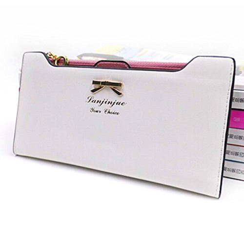 GTT Women wallet Golden Bow knot Long PU Leather Card Holders Clips Flower Hasp Buckle Open Wallets Clutch Long Purse(white)