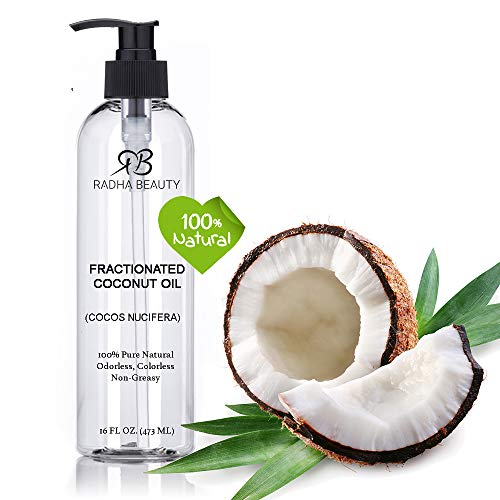 Radha Beauty Fractionated Coconut Oil - 100% Pure & Natural Carrier and Base Oil for Aromatherapy, Hair and Skin - Comes with Pump, 16 fl oz.