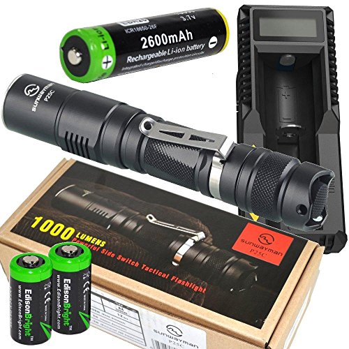 Sunwayman P25C 1000 Lumen CREE XM-L2 U2 LED long throw tactical flashlight with Niteocre UM10 USB charger, EdisonBright EBR26 2600mAh rechargeable 18650 Battery and 2 X EdisonBright CR123A Lithium Batteries Bundle