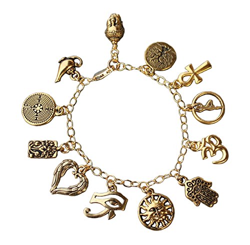 Night Owl Jewelry 22k Gold Plated Deluxe Ancient Religions Charm Bracelet- 14k Gold-Fill Chain- Peace, Coexist- Sizes XS-XL