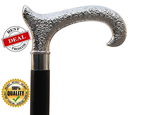 SouvNear Derby Canes and Walking Sticks - Victorian Stick 37” Vintage Ebony Black Wooden Cane for Men and Women - Nickel Plated Cane with Handle in Silver Tone