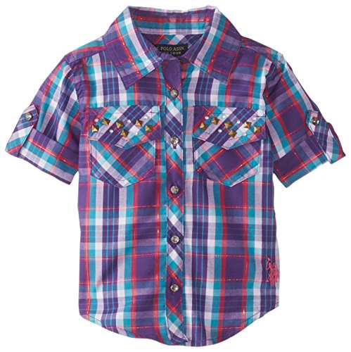 U.S. Polo Assn. Baby Girls' Plaid Rhinestone Studded Shirt with Roll Cuff Sleeve, Modern Azure, 18 Months