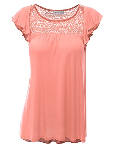 Doublju Loose Fit Ruffle Cap Sleeve Lace Blouse Top (Plus Size Available) Peach Small