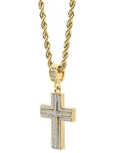Mens 14k Gold Plated Stardust Two Cross Thick Pendant Hip-Hop 4mm 24" Rope Chain Necklace