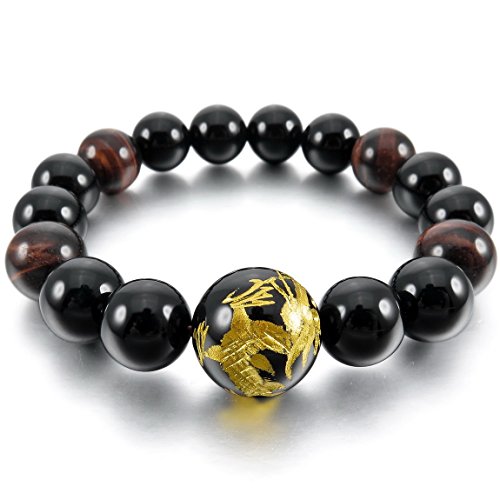 INBLUE Men,Women's 12mm 14mm Energy Bracelet Link Wrist Energy Stone Black Gold Tone Dragon Buddha Mala Bead
