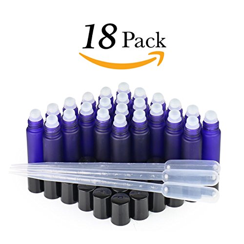 New Professional Use 10ml Cobalt Blue Glass Roll-on Empty Refillable Bottles with Black Cap Perfect for Aromatherapy Perfumes, Comes with Two 3ml Plastic Dropper, Pack of 18 Individual Roller Bottles