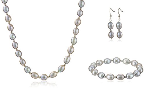 Sterling Silver Grey Freshwater Cultured Pearl Necklace, Bracelet and Dangle Earrings Jewelry Set (8-9mm)