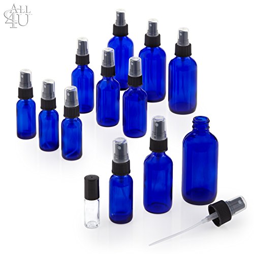 All4you Cobalt Blue Boston Round Bottles with Sprayers Pack of 12 - 1 Oz. 2 Oz. 4 Oz. - 4 of Each + A Free Gift