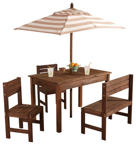 KidKraft Wooden Outdoor Children's Patio Set with Table, 2 Chairs & Beige & White Striped Fabric Umbrella