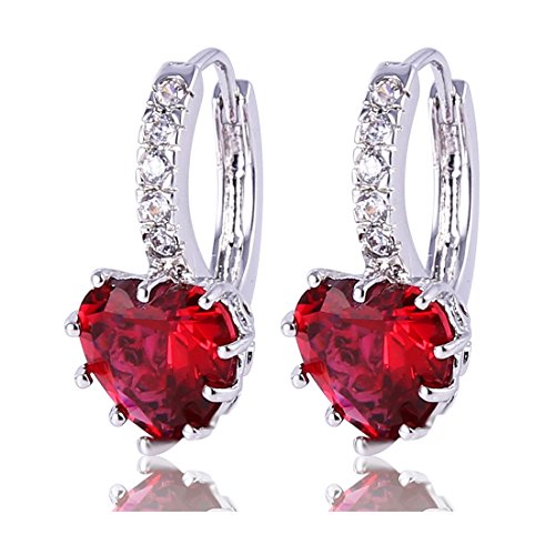GULICX White Gold Tone Cubic Zirconia Heart Red Pierced Huggie Hoop Earrings Ruby Color Girl Gift