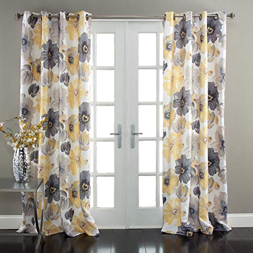 Lush Decor Leah Floral Darkening Yellow and Gray Window Curtain Panel Set for Living, Dining Room, Bedroom (Pair), 84" L