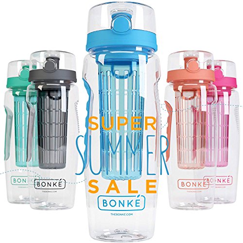 Bonke Fruit Infuser Water Bottle - Free Infused Water Ebook and Cleaning Brush - 2-in-1 - Large 32 Oz - BPA Free Plastic & Rubber Grip with Extra Safe Locking System Prevents Spills & Leaks