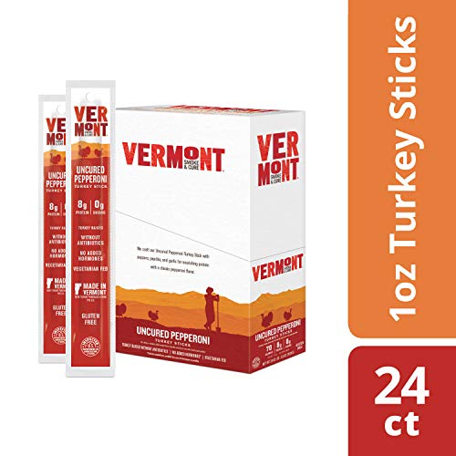 Vermont Smoke & Cure Jerky Sticks - Antibiotic Free Turkey - Gluten Free - Great Keto Snack, High in Protein & Low Sugar - Uncured Pepperoni - 1oz Stick - 24 Count