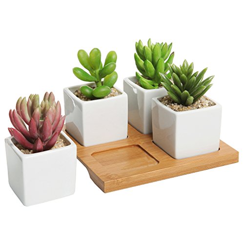 4 Piece Modern White Mini Square Cube Ceramic Succulent Planters / Flower Pots w/ Bamboo Tray - 2x2 Inch