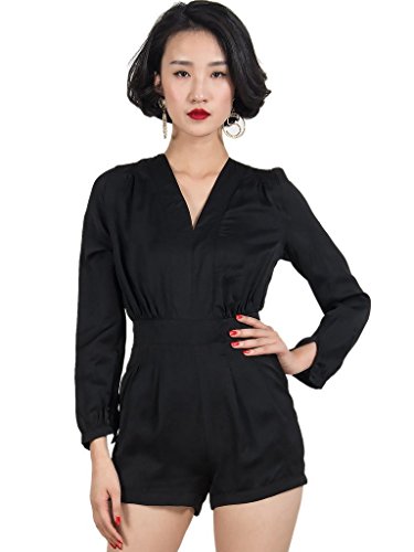 Choies Women's Polyester Plain Long Sleeve V Neck Black Shorts Loose Playsuit