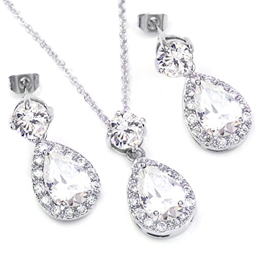 FC JORY White Gold GP Clear CZ Crystal Teardrop Bridal Necklace Dangle Earrings Jewelry Set