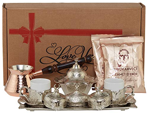 "Silver" 16 Pieces Turkish Greek Arabic Coffee Set with Cups Saucers Copper Pot Sugar Bowl and Coffee