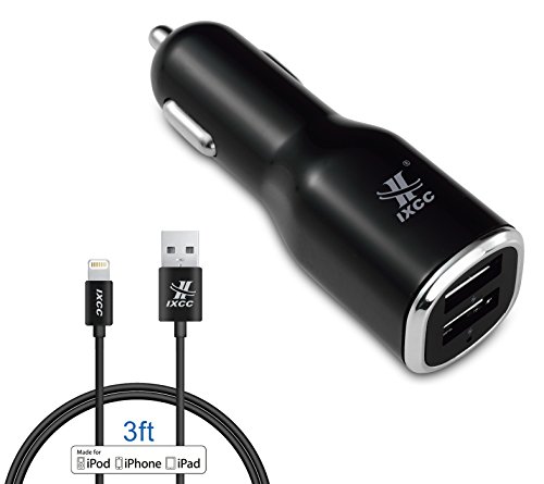 iXCC Car charger, 24W 4.8A Dual USB Universal Fast Car Charger Bundle with 8-pin Apple MFi Cable for Apple Devices - Black