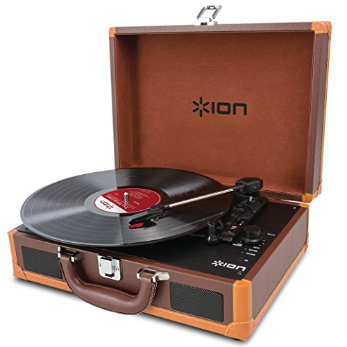 ION Audio Vinyl Motion Deluxe | Portable 3-Speed Belt-Drive Suitcase Turntable with Built-In Speakers (Brown-Leather Styling)