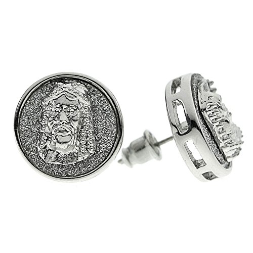 Round Jesus Christ Face Head Silver Finish Sparkle Iced-Out Big Circle Hip Hop Sparkly Glitter Earrings